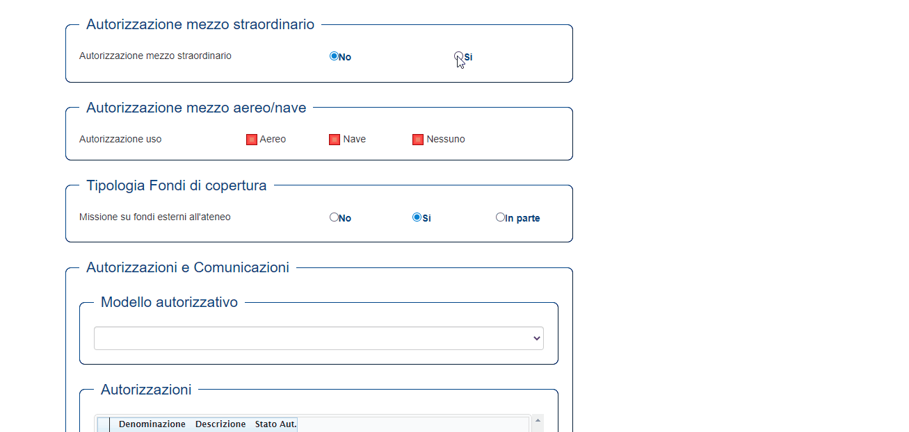 Quando si intende richiedere l'autorizzazione all'utilizzo di taxi, auto propria o a noleggio è necessario intervenire sulla sezione apposita dell'interfaccia.