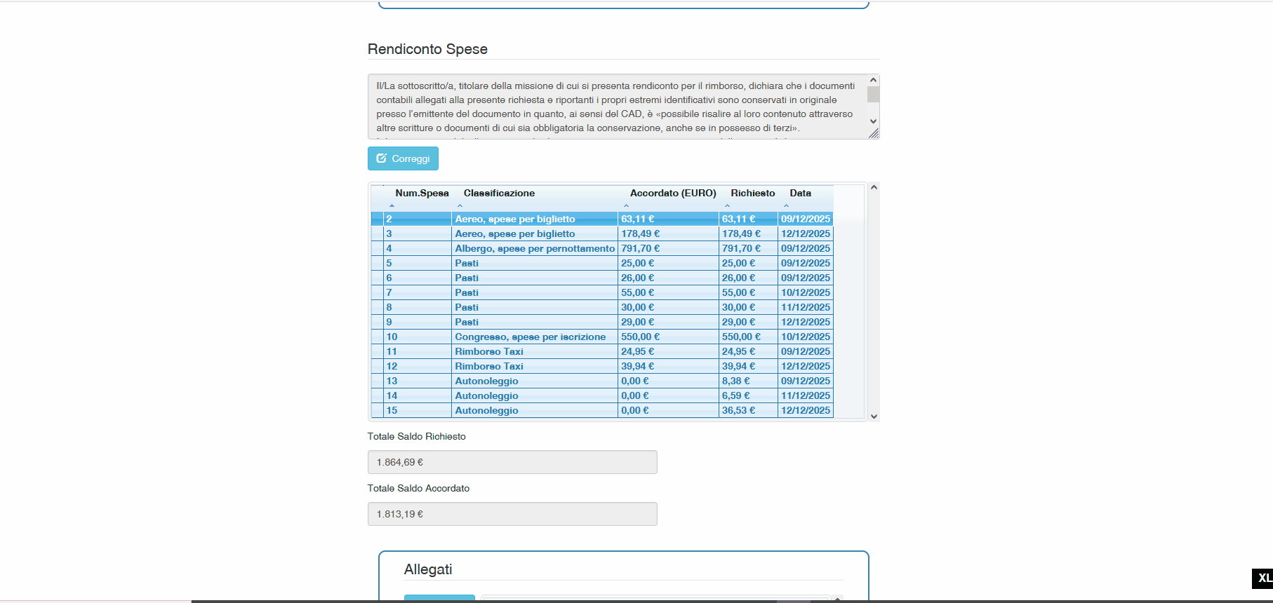 Accedendo al sistema e recuperando la propria richiesta di missione è possibile esaminare le singole voci di spesa.